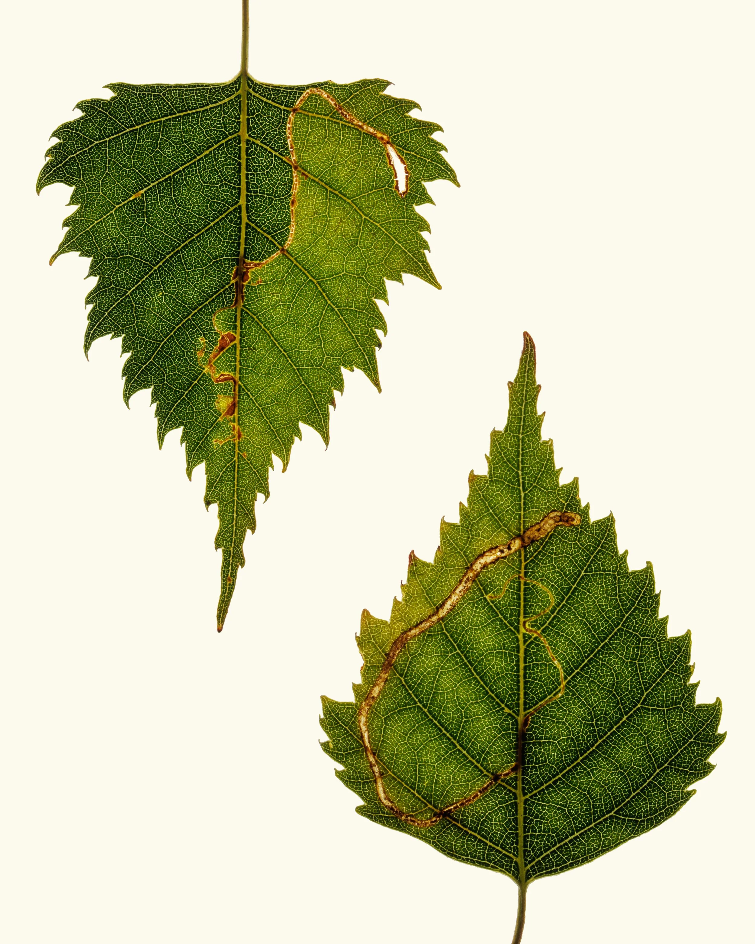 Alyson Macdonald is an Edinburgh-based photographer who works across genres but specialises in illuminating the small details that often go unnoticed. She draws inspiration from her environment, whether natural or built, and is fascinated by the intersections between the two. Over the past two years she has made many photographs of the delicate structures of leaves, all of which were collected in and around Leith. This image shows two birch leaves with "mines" created by insect larvae that burrowed through the leaves before emerging to the next stage in their lifecycle. More info here.